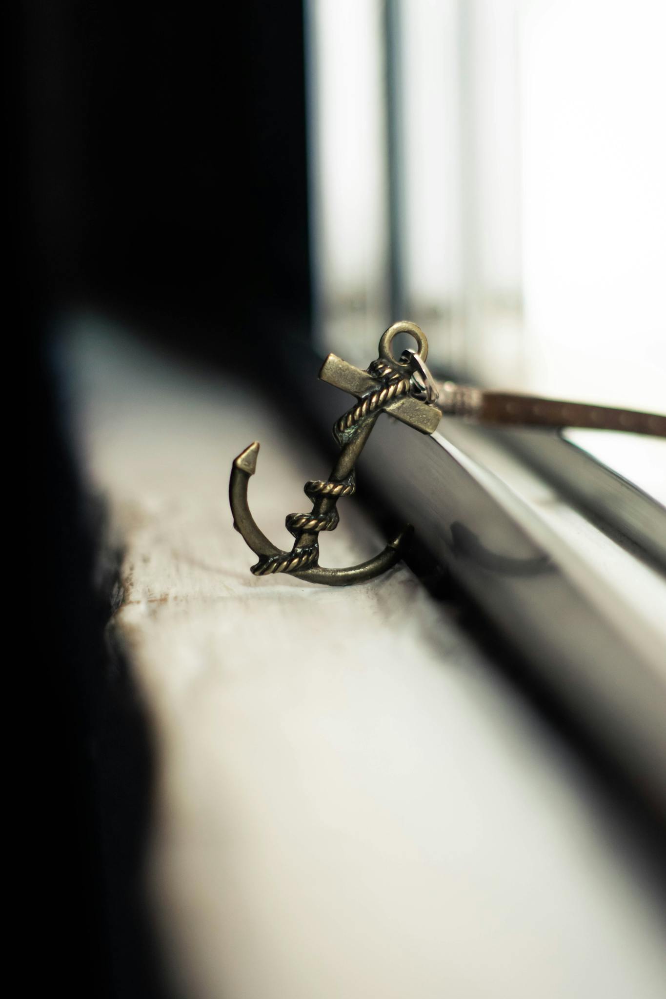 Soft focus of metal stylish charm in anchor shape with leather strap placed on grunge windowsill